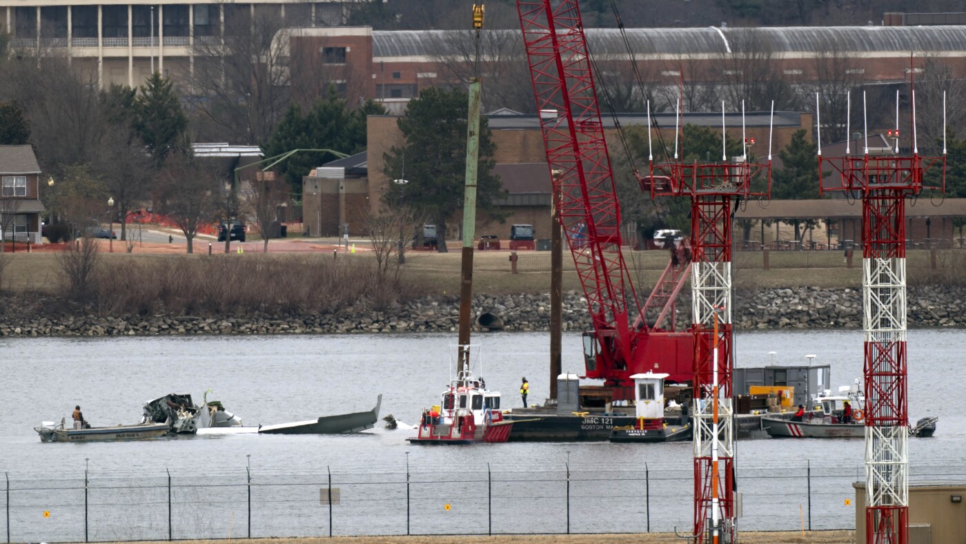 Rescue and salvage crews work near the wreckage of an American Airlines jet in the Potomac River near Ronald Reagan Washington National Airport on Sunday in Arlington, Va.