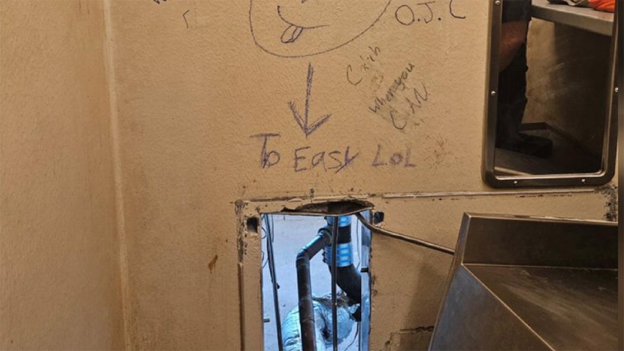They left messages, including “up to light lol” and “we innocent” on the wall next to the hole through which they fled.