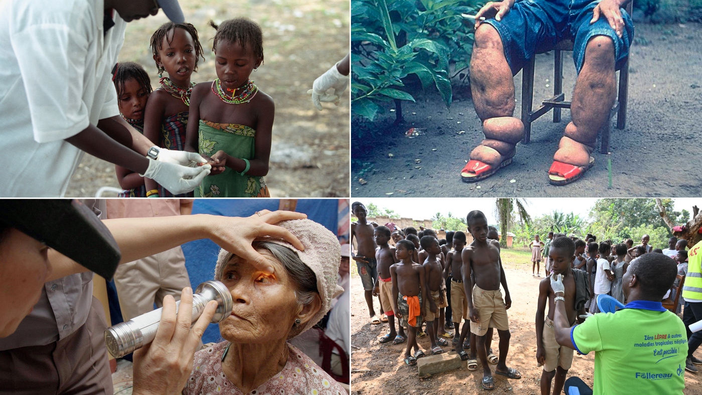 Clockwise from upper left: Nomads from the Peul tribe give blood samples to be tested for sleeping sickness. In 2024, Chad got rid of one form of the disease. Brazil and Timor Leste eliminated lymphatic filariasis, the disfiguring parasite that causes a condition known as elephantiasis. A doctor sees children during a leprosy screening campaign; Jordan eliminated the disease this year. An elderly farmer woman receives an eye exam for trachoma in Vietnam — which along with India and Pakistan — eradicated the disease, which causes blindness, in 2024.