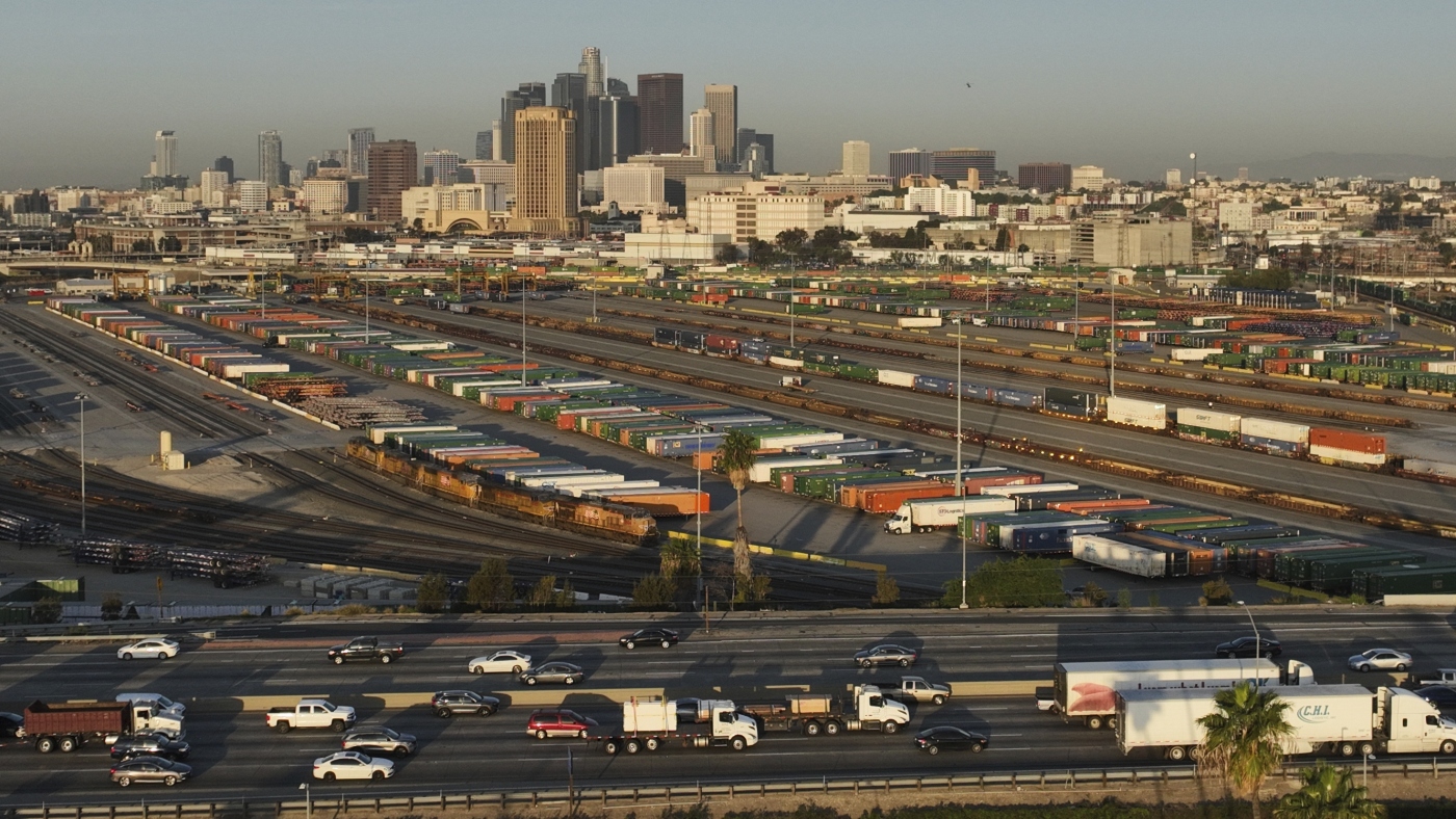 Traffic flows on Interstate 5 past shipping containers near downtown Los Angeles, Tuesday, April 8, 2025.