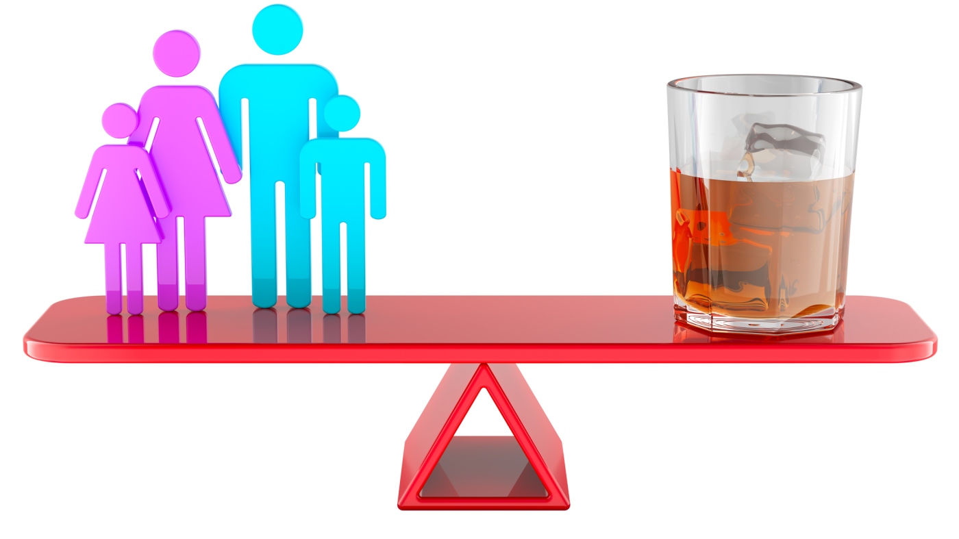 This image shows a red seesaw. On the right side is a glass with an amber-colored alcoholic beverage and ice cubes. On the left side are abstract images of a man and boy in blue and a woman and girl in purple.