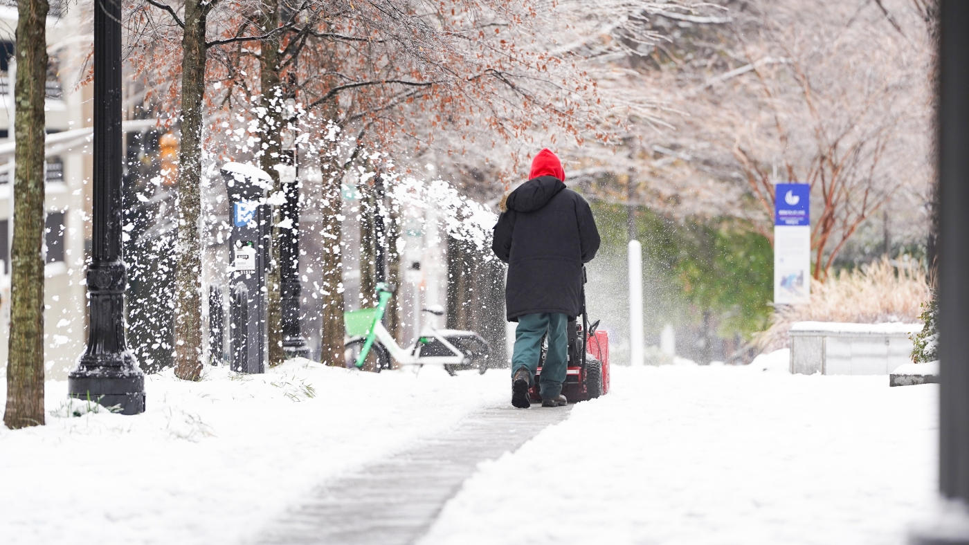 A man uses a snow blower following a snowstorm on Friday in Atlanta.