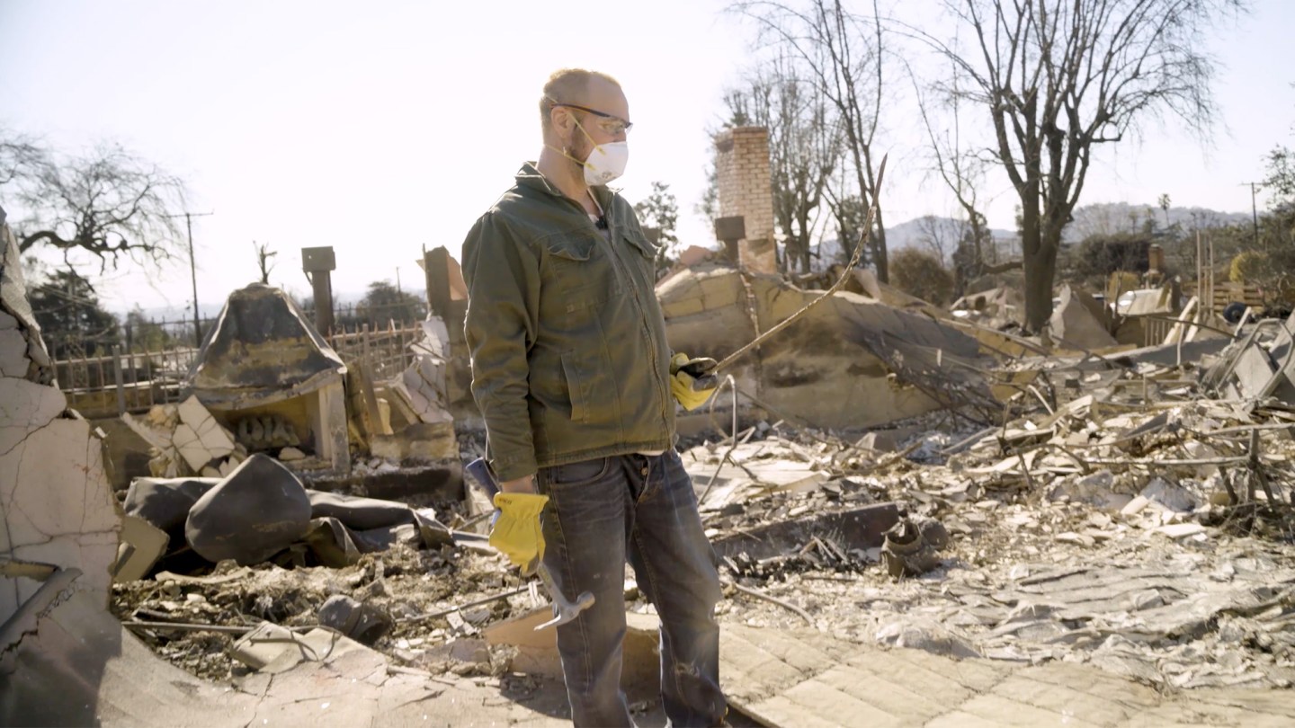 Shire, a producer on the popular web series Critical Rolewas able to race home from work the night of Jan. 7 and gather some belongings, as well as their four cats. But when Sims, a former VFX artist on The Hunger Games and X-Men: Apocalypse who now directs projects for drag queens, returned from a gig out of state, he realized that he had forgotten to ask Shire for the retrieval of a precious family heirloom. That’s why the couple is back here one week later: to dig through the rubble in an attempt to find a katana sword said to have been surrendered to Sims’ grandfather William J. Sims II, then a major in the U.S. Marine Corps, near the end of World War II.