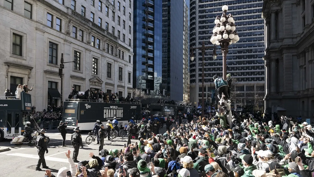 People participate in Philadelphia Eagles’ victory parade after winning the Super Bowl Lix against Kansas City Chiefs. Philadelphia, Pennsylvania, USA, February 14, 2025. (Mostafa Bassim/Anadolo via Getty Images)