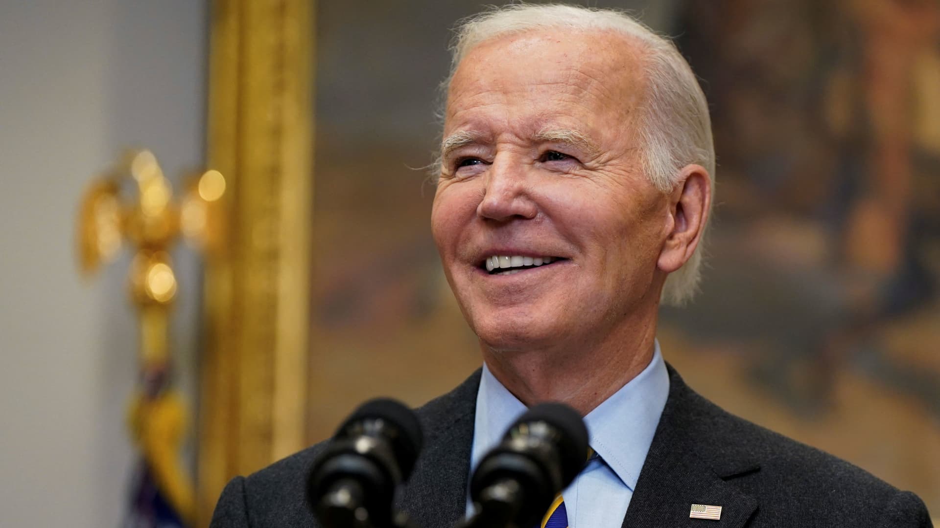 U.S. President Joe Biden reacts as he speaks from the Roosevelt Room on the jobs report and the state of the economy at the White House in Washington, U.S., on January 10, 2025.