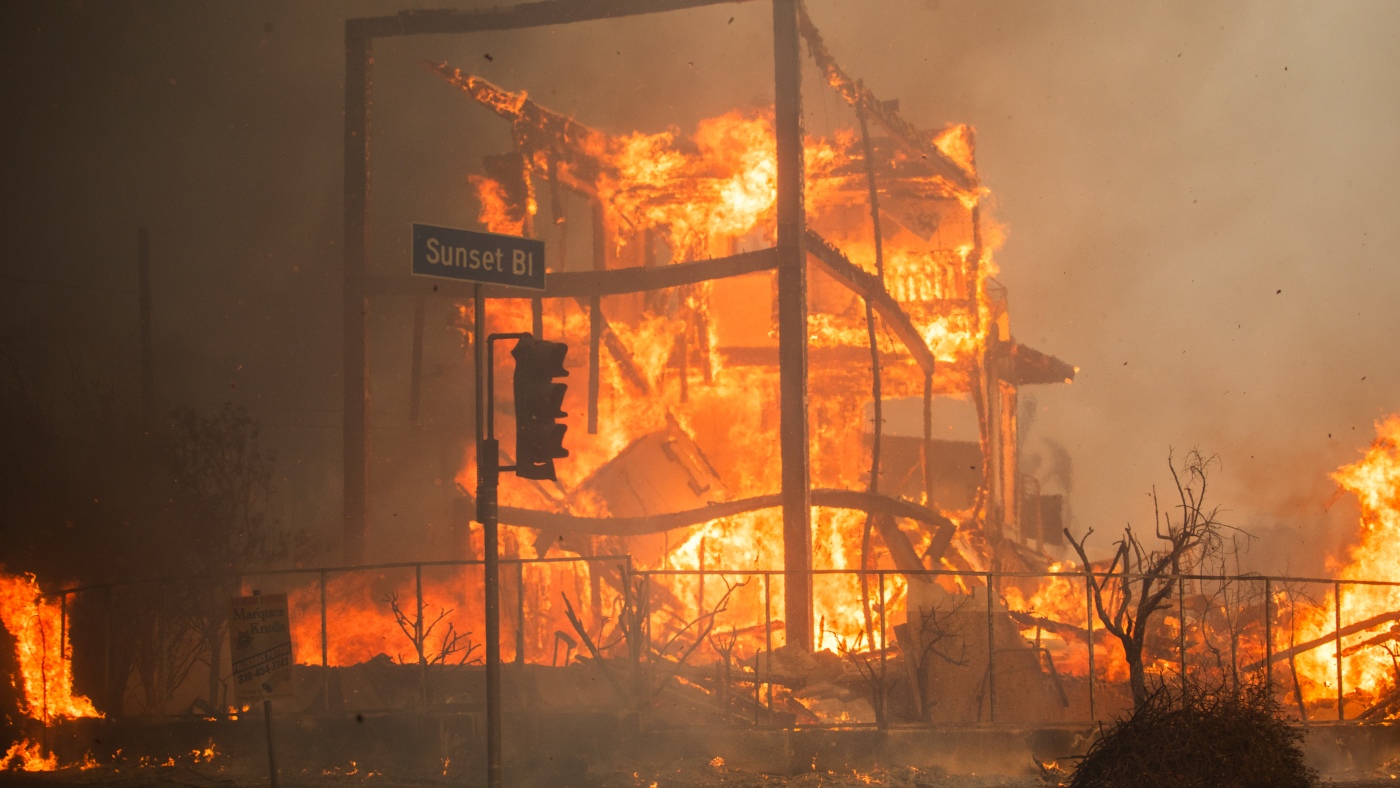 Flames from the Palisades Fire burn a building on Sunset Boulevard amid a powerful windstorm on Jan. 8 in the Pacific Palisades neighborhood of Los Angeles, California.