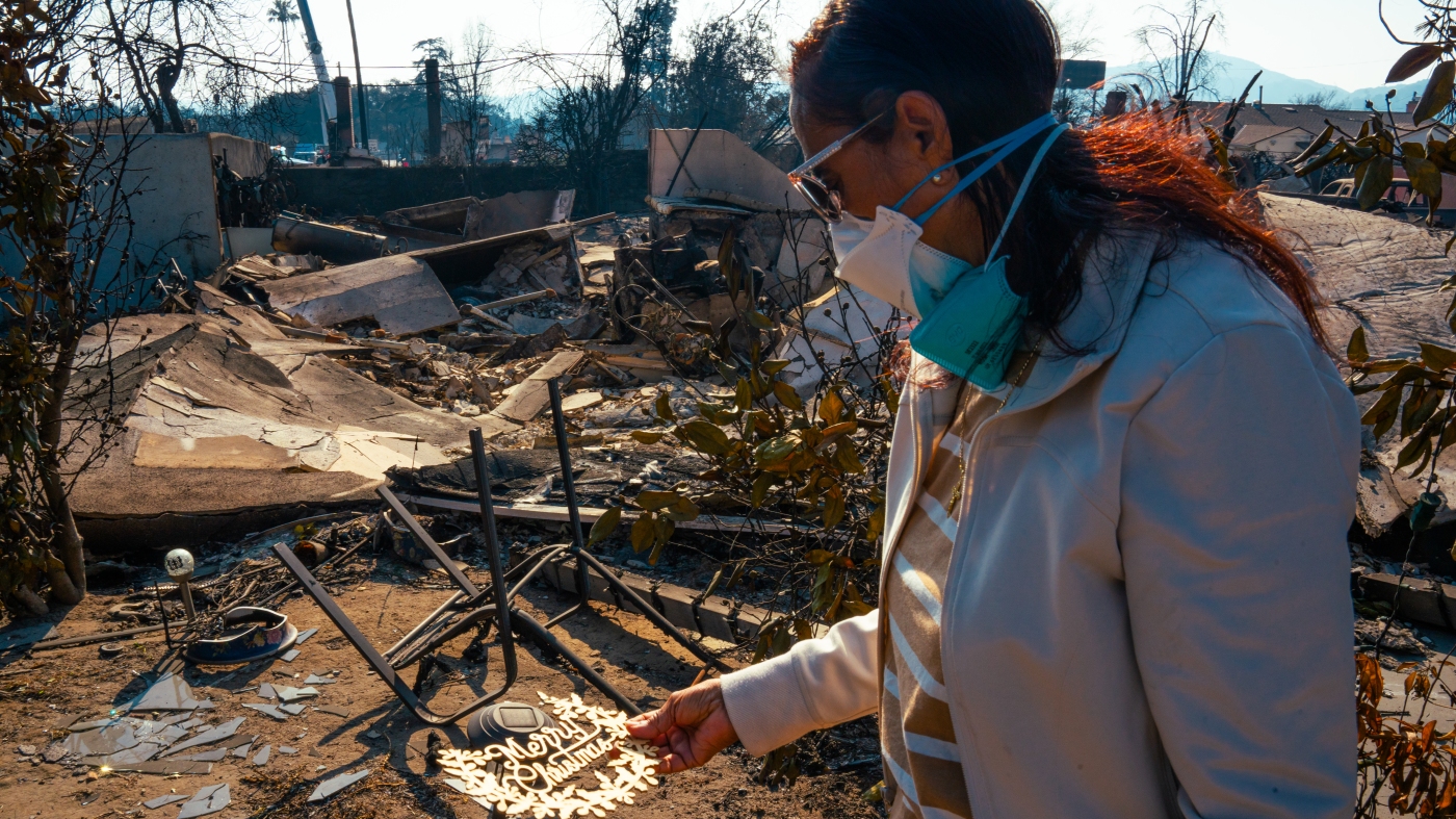 Margaret Larkin holds a piece of her Christmas decor outside of what remains of her home. Larkin lived on her block in Altadena, Calif. for 36 years.