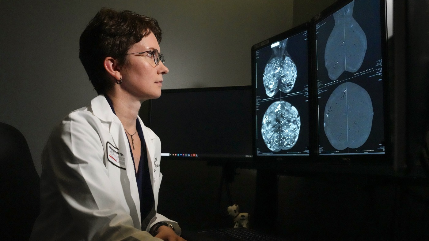 Dr. Olena Weaver of MD Anderson Cancer Center in Houston looks at mammogram imagery. The regular mammogram on the left shows a woman with dense breast tissue; on the right is a contrast-enhanced mammogram.