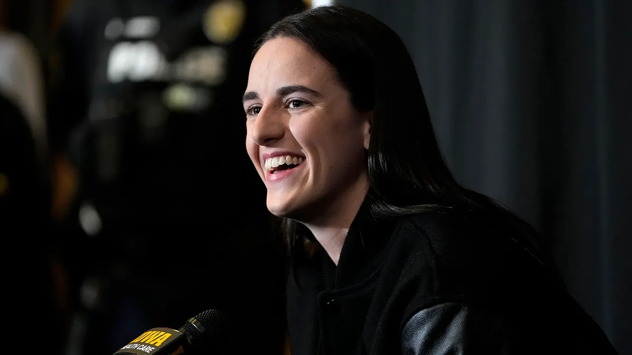 Former Iowe guard and current Indiana Fover player Wnba Caitlin Clark speaks during a press conference before the game between Iowa and USC, February 2, 2025 in Iowa. (AP Photo/Charlie Neibergall)