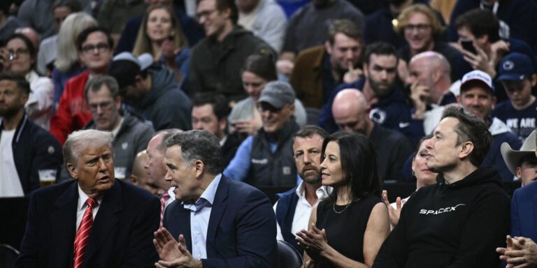 The President of the US Donald Trump, Senator Dave McCormick, his wife Dina Powell McCormick and Elon Musk watched the Wells Fargo Center at Philadelphia Center in Philadelphia, Pennsylvania, March 22, 2025. Photo by Brendan Smowskowski / AFP by GETTY…