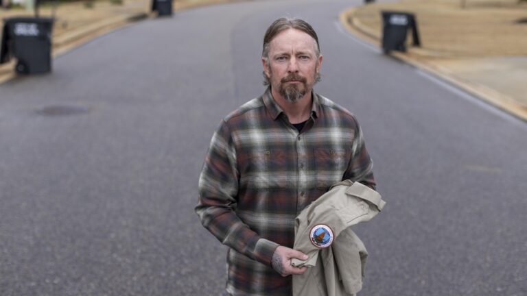 Derek Copeland, who was recently fired from the U.S. Department of Agriculture, holds a USDA work shirt near his residence in Opelika, Alabama. The Air Force veteran had worked as a dog trainer for the USDA. Alyssa Pointer for NPR…