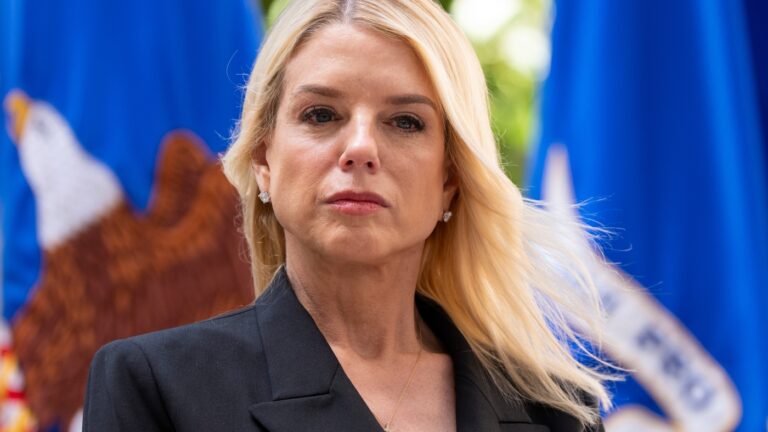 Attorney General Pam Bondi listens during a news conference at the Department of Justice on May 7, 2025 in Washington. In late April, the DOJ’s Office of Justice Programs cancelled hundreds of public safety grants to local police and nonprofits,…
