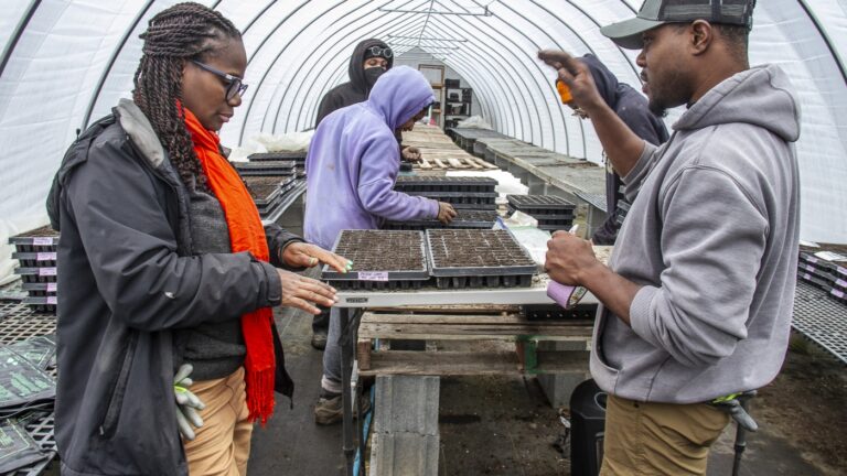 Farmer Gale Livingstone alongside volunteers Sydney Harris, Lewis Taylor, Emmani Phillips-Quigley and Jimi Palmer plant seeds at Deep Roots Farm in Upper Marlboro, Md. Dee Dwyer/for NPR hide caption toggle caption Dee Dwyer/for NPR UPPER MARLBORO, Md. – On a…