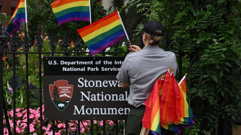A National Park Service ranger places rainbow flags on the fence at the Stonewall National Monument in the West Village neighborhood of Greenwich Village in Lower Manhattan, New York City, on June 19, 2019. Timothy A. Clary/AFP via Getty Images…
