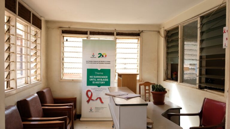 The unstaffed reception area at the Kampala offices of Uganda Young Positives (UYP) on February 12. UYP is a nongovernmental organization that aims to improve the quality of life for young people living with HIV/AIDS and reduce infection rates through…