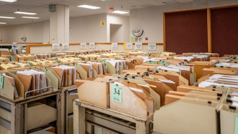 The IRS says it processed 11.7 million tax returns in the first week of the 2025 filing season. Here, carts loaded with documents are seen at an IRS processing facility in Austin, Texas, last September. Brandon Bell/Getty Images hide caption…