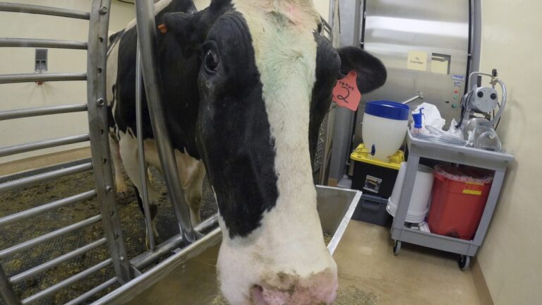 In this photo provided by the U.S. Department of Agriculture, a lactating dairy cow stands in a pen after inoculation against bird flu at the National Animal Disease Center research facility in Ames, Iowa, on Monday, July 29, 2024. U.S.…