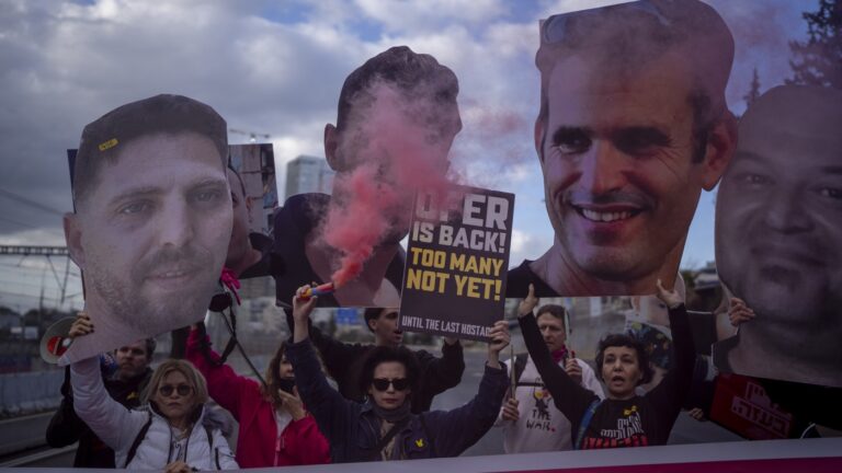 Relatives and supporters of Israelis held hostage in the Gaza Strip, hold photos depicting their faces during a protest demanding their release from Hamas captivity, in Tel Aviv, Israel on Thursday. Oded Balilty/AP hide caption toggle caption Oded Balilty/AP TEL…