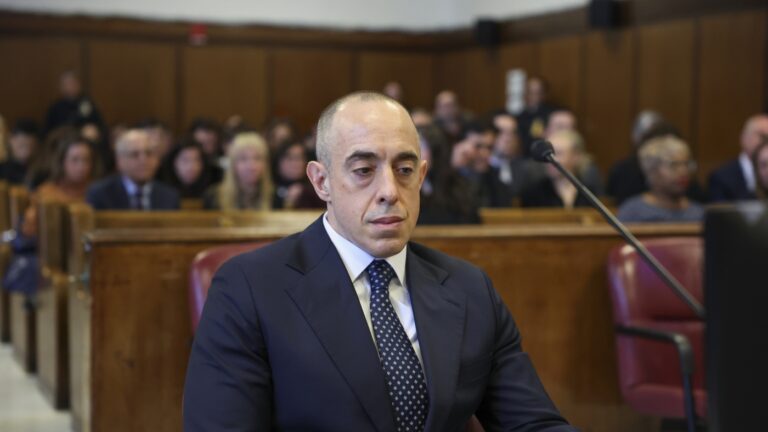 Emil Bove, then President Trump’s attorney, looks on as Trump appears remotely for a sentencing hearing in Manhattan Criminal Court on Jan. 10, 2025, in New York City, after being found guilty of falsifying business records. Jeenah Moon-Pool/Getty Images hide…
