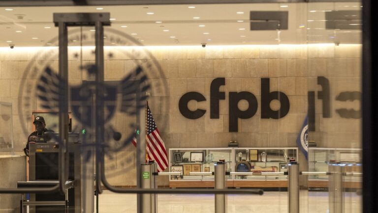 A security officer works inside of the Consumer Financial Protection Bureau (CFPB) building headquarters on Monday in Washington. Staff and contractors have been told the building is closed for the week, and to perform no work. Jacquelyn Martin/AP/AP hide caption…