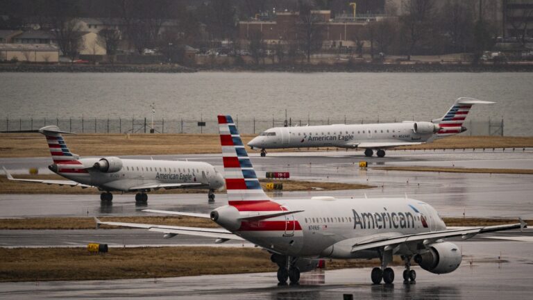 American Eagle and American Airlines planes taxi at the Ronald Reagan Washington National Airport, on February 6, 2025 in Arlington, Va. The Federal Aviation Administration has reopened two of the airport’s runways following the January 29 mid-air collision between a…