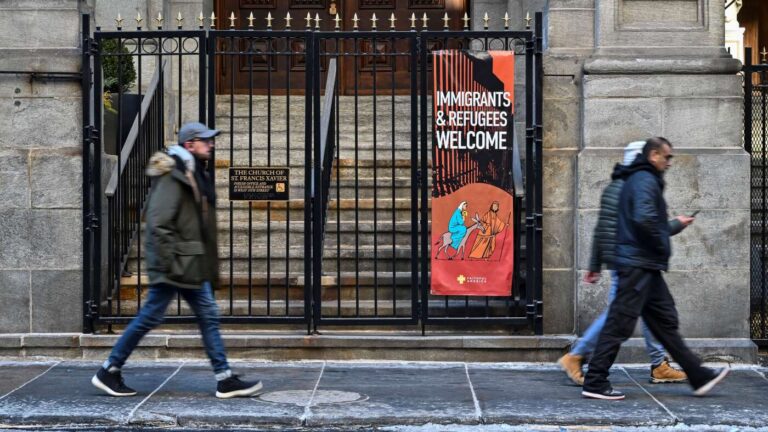A church displays a sign saying, “Immigrants & Refugees Welcome” in New York. Angela Weiss/AFP hide caption toggle caption Angela Weiss/AFP More than two dozen religious groups are suing the federal government in response to the Trump administration’s policy giving…