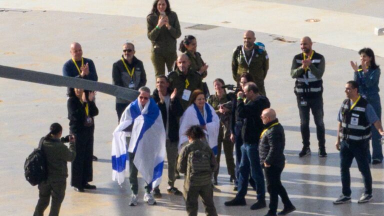 Released hostage Ohad Ben Ami draped in an Israeli flag arrives at Tel Aviv Sourasky Medical Center – Ichilov Hospital by helicopter, on Feb. 8, in Tel Aviv, Israel. Alexi J. Rosenfeld/Getty Images hide caption toggle caption Alexi J. Rosenfeld/Getty…