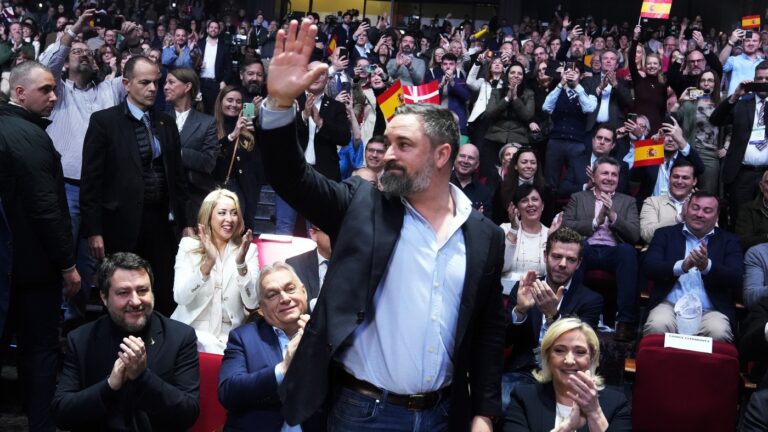 Spanish far-right VOX party leader Santiago Abascal, centre, waves next to European far-right politicians during the Patriots for Europe summit in Madrid, Spain, Saturday, Feb. 8, 2025. From left, Italy’s vice Premier Matteo Salvini, Hungarian Prime Minister Viktor Orban, far-right…