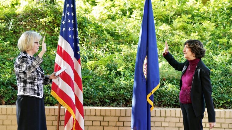 Former EEOC Commissioner Jocelyn Samuels, shown at right, President Trump’s pick in his first term to fill a Democratic seat on the commission, is sworn in by then-EEOC Chair Janet Dhillon, left, on October 14, 2020. U.S. Equal Employment Opportunity…