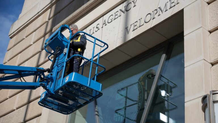 On February 7, a worker removes the U.S. Agency for International Development sign on their headquarters in Washington, D.C. The Trump administration has targeted with agency with a series of orders that have put its programs and employees in limbo.…