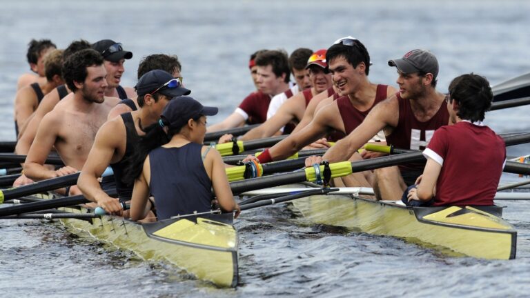 Members of Yale crew, left, and Harvard crew, right, greet one another after the 4-mile course along the Thames River for the 146th Harvard-Yale Regatta, in New London, Conn., on May 28, 2011. Jessica Hill/AP hide caption toggle caption Jessica…