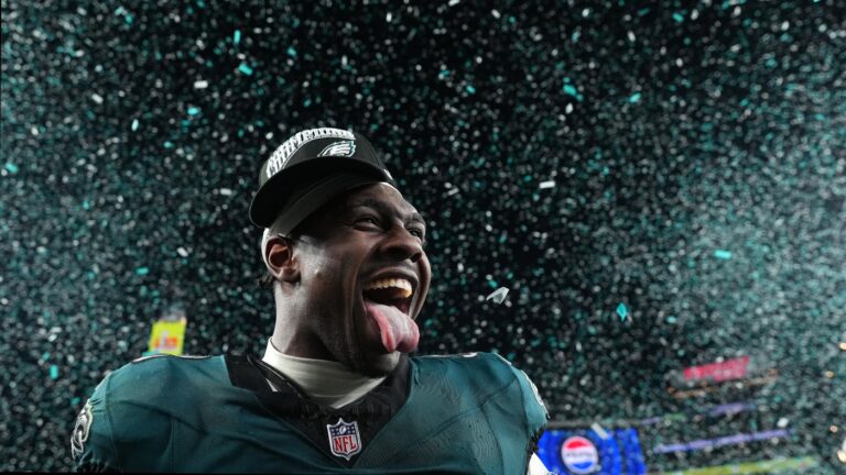 PHILADELPHIA, PENNSYLVANIA – JANUARY 26: Jalyx Hunt #58 of the Philadelphia Eagles celebrates after their 55-23 win against to the Washington Commanders during the NFC Championship Game at Lincoln Financial Field on January 26, 2025 in Philadelphia, Pennsylvania. (Photo by…