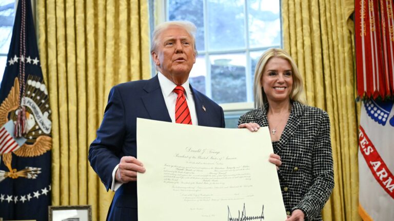 President Trump and Pam Bondi pose with the official commission signed by Trump that appoints Bondi to the position of U.S. Attorney General after she was sworn in in the Oval Office on Wednesday. Andrew Caballero-Reynolds/AFP via Getty Images hide…