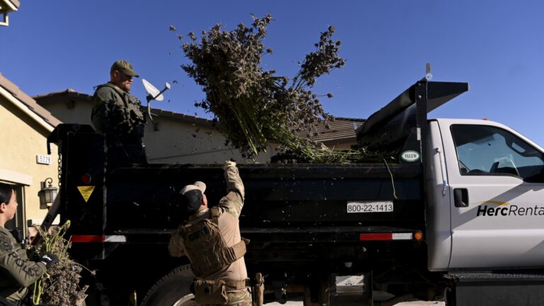 In much of the U.S., illegal cannabis outcompetes legal weed sold in licensed shops. Officers with the law enforcement division of the California Department of Cannabis Control confiscate unlicensed marijuana plants in the Goldridge neighborhood of Fairfield, Calif., on Jan.…