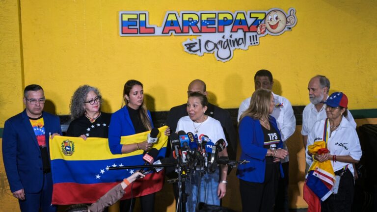 Venezuelan community leaders speak to the media as they protest against the suspension of Temporary Protected Status in Doral, Florida, on Monday. The Trump administration is terminating an immigration program that currently protects hundreds of thousands of Venezuelan migrants in…