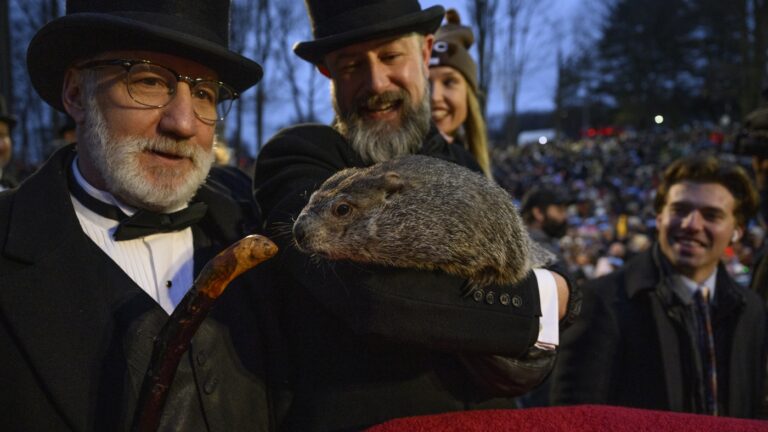 Punxsutawney Phil makes his annual winter forecast to Groundhog Club Inner Circle President Tom Dunkel, left, who looks on as the groundhog is held by A.J. Dereume on Feb. 2, 2024. The Inner Circle’s members have “the Groundhog gene,” Dereume…