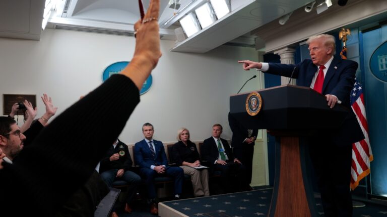 President Trump takes questions from reporters at the White House on Thursday about the collision of an American Airlines flight with a military Black Hawk helicopter near Ronald Reagan Washington National Airport. Chip Somodevilla/Getty Images hide caption toggle caption Chip…