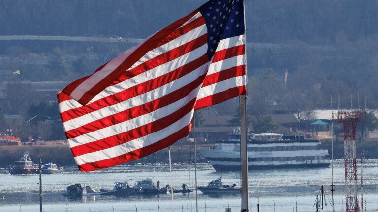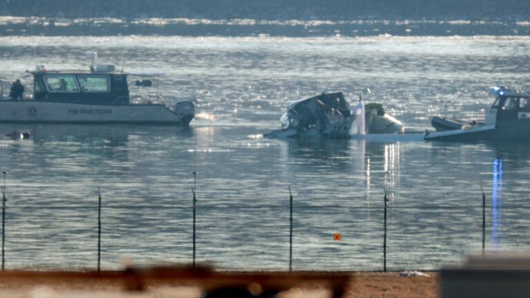 Emergency response units search the crash site of an American Airlines plane on the Potomac River after a crash while on approach to Reagan National Airport on Jan. 30, 2025 in Arlington, Va. The American Airlines flight from Wichita, Kan.,…