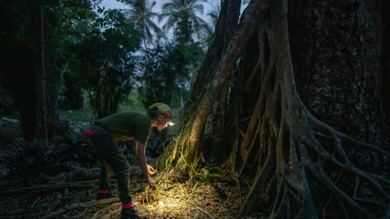 Amanda Vicente Santos, a bat disease ecologist at the University of Oklahoma, inspects the base of a guanacaste tree in Belize where she intends to trap vampire bats later in the night. Scientists say they’ve developed an alternate method of…