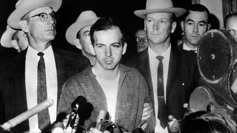 President John F. Kennedy’s assassin, Lee Harvey Oswald, during a news conference after his arrest in Dallas, on Nov. 22, 1963. Oswald was killed by Jack Ruby two days later, on the eve of Kennedy’s burial. AFP/Getty Images hide caption…