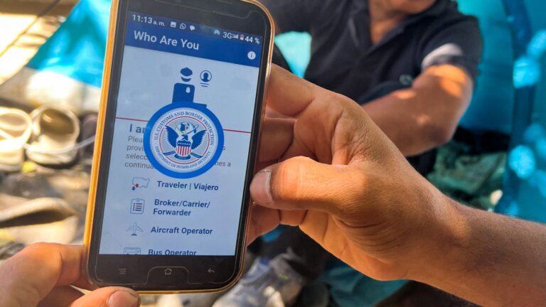 A migrant at the U.S.-Mexico border shows the CBP One App from the U.S. Customs and Border Protection agency that is used to apply for an appointment to apply for asylum. Gilles Clarenne/AFP via Getty Images hide caption toggle caption…