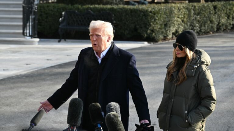 President Trump, shown here standing with first lady Melania Trump, speaks to reporters at the White House before leaving for his trip to North Carolina and California on Jan. 24. Pedro Ugarte/AFP via Getty Images hide caption toggle caption Pedro…