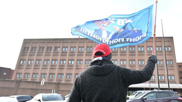 A supporter of President Trump’s waves a flag Tuesday outside a Washington, D.C., jail where some defendants from the Jan. 6 attack on the U.S. Capitol were being held. On Monday, Trump signed pardons for more than 1,500 people charged…
