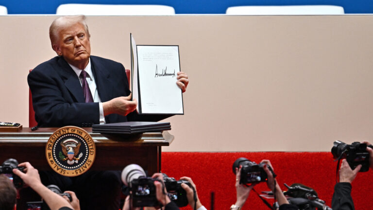 US President Donald Trump signs executive orders during the inaugural parade inside Capital One Arena, in Washington, DC. ANGELA WEISS/AFP via Getty Images hide caption toggle caption ANGELA WEISS/AFP via Getty Images US President Donald Trump signs executive orders during…