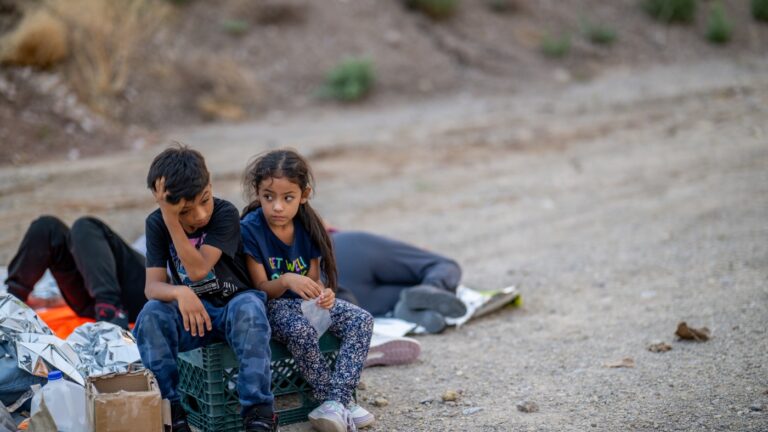 Children of the Rivera family look towards the sky while waiting to be apprehended by U.S. Customs and Border protection officers after crossing over into the U.S. in June 2024 in Ruby, Ariz. Brandon Bell/Getty Images hide caption toggle caption…