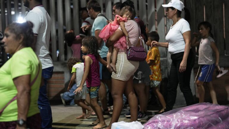 People displaced by violence in towns across the Catatumbo region, where rebels of the National Liberation Army, or ELN, have been clashing with former members of the Revolutionary Armed Forces of Colombia, arrive for shelter at a soccer stadium in…