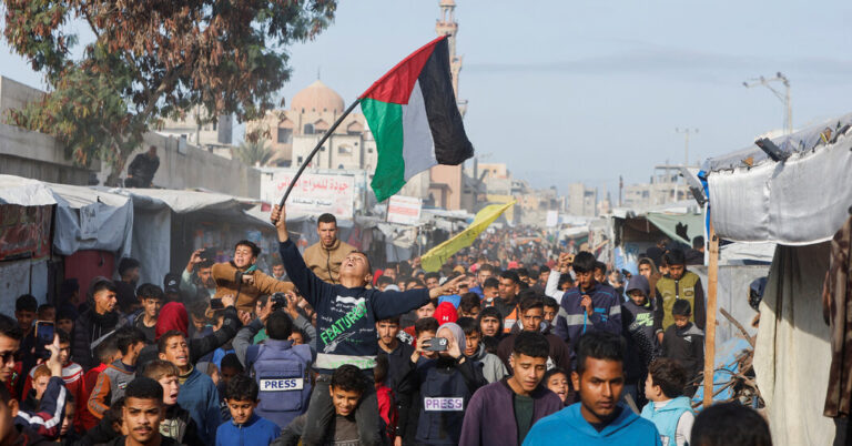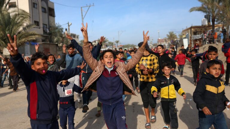 Children cheer in Nuseirat in the central Gaza Strip on January 19, 2025, shortly before a ceasefire deal in the war between Israel and the Palestinian militant group Hamas was implemented. Bashar Taleb/AFP via Getty Images hide caption toggle caption…