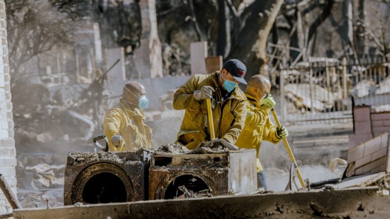 Firefighters clean up after the Eaton Fire in California. Health experts recommend wearing particle-filtering masks, goggles, gloves, and other personal protective equipment while cleaning up the potentially toxic ash and smoke after the burn. DAVID PASHAEE/Middle East Images/AFP via Getty/AFP…