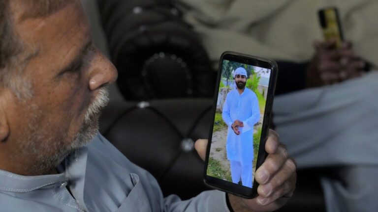 A Pakistani Mohammad Akram shows a picture of his son Abu Bakar, one of the victims of a migrant boat that capsized in West Africa’s Atlantic coastline, on his cell phone at his home, in Jura village, in the Lalamusa…