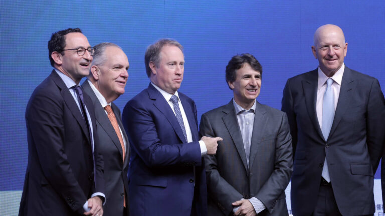 Jonathan Gray, president and chief operating officer of Blackstone Inc., from left, Ron O’Hanley, chief executive officer of State Street Corp., Ted Pick, chief executive officer of Morgan Stanley, Marc Rowan, chief executive officer of Apollo Global Management LLC, and…